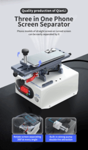 La Liangwei Q7 est une machine de séparation professionnelle 3 en 1, conçue spécialement pour le démontage rapide et sécurisé des écrans incurvés et tactiles LCD. Grâce à son plateau rotatif à 360°, elle offre un angle de travail optimal pour chaque type d’écran, réduisant les risques de casse.