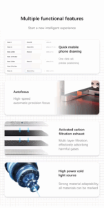 De plus, elle dispose d’une connexion WiFi intégrée. Cette fonction permet de transférer facilement des fichiers, photos ou réglages depuis un téléphone. Vous pouvez également graver du texte, des logos ou des motifs sur mesure.